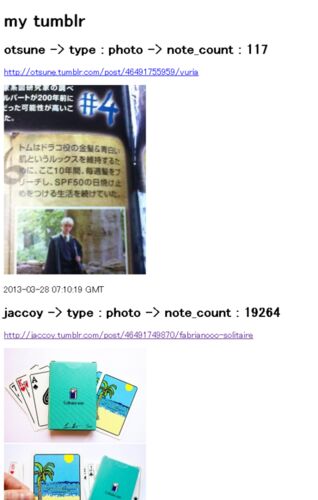 tumblr大好きなんだけど、平日は仕事やなんやかんやでみるひまほとんどないので、いい感じにreblogされてるquoteとphotoを取ってきてそれをhtmlにしてみるやつ作った。ここを参考にやったんだけど、すごいわかりやすくて勉強になった。 RubyからTumblrへの投…