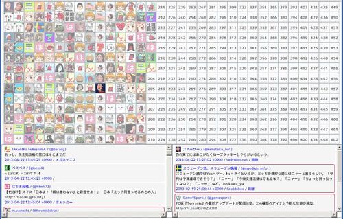 仕事の合間にtwitterのタイムライン追うのまず無理というかめんどいので、流れだけでもみえるようにしたくて仕事に合間に作ってみた。こんな風にリアルタイムにフォロー中のひとのアイコンが出てきてどんどんマトリックスを埋めてくる。 retweetはRとか鍵付…